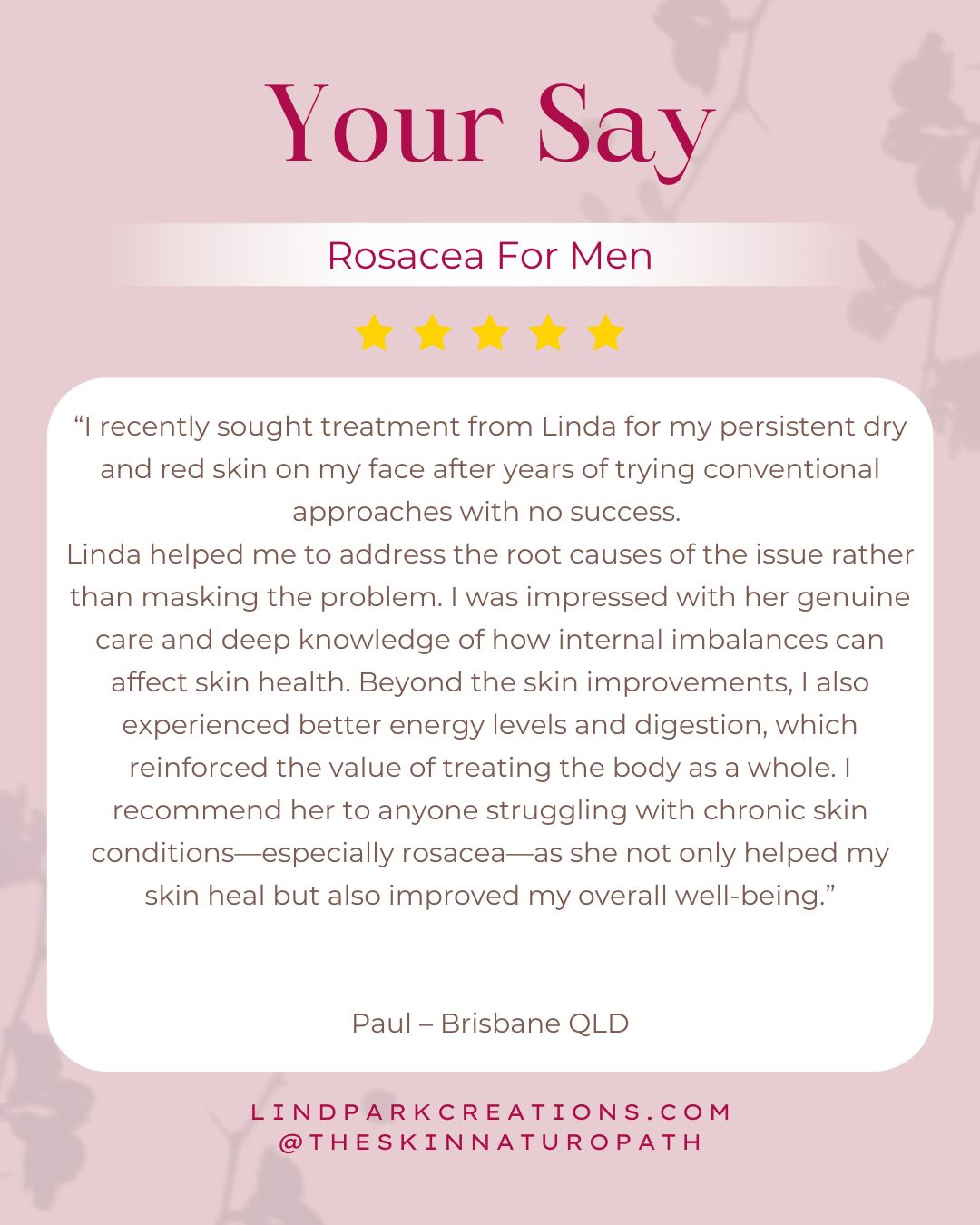 As part of your Rosacea to Radiance Program, you’ll receive six dedicated follow-up consultations with Linda Parker ND, Naturopath Sunshine Coast, specialising in chronic skin conditions. These sessions provide ongoing guidance to help manage redness, irritation, and flare-ups while supporting long-term skin health.