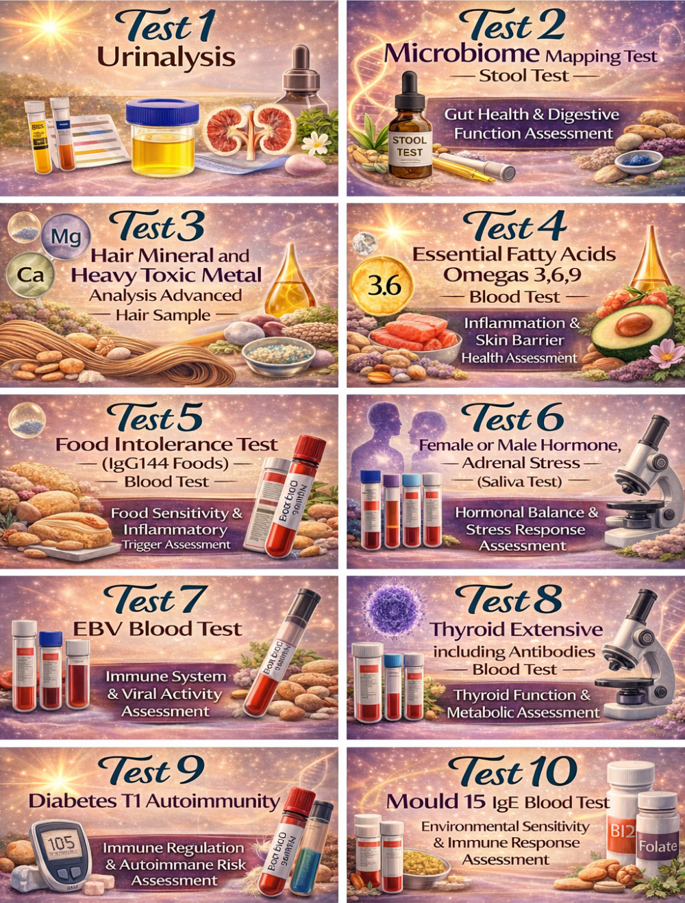 This test analyzes mineral levels and heavy metal accumulation in your hair. Essential minerals support skin health, immune function, and detoxification, while toxic metals may contribute to inflammation and oxidative stress.